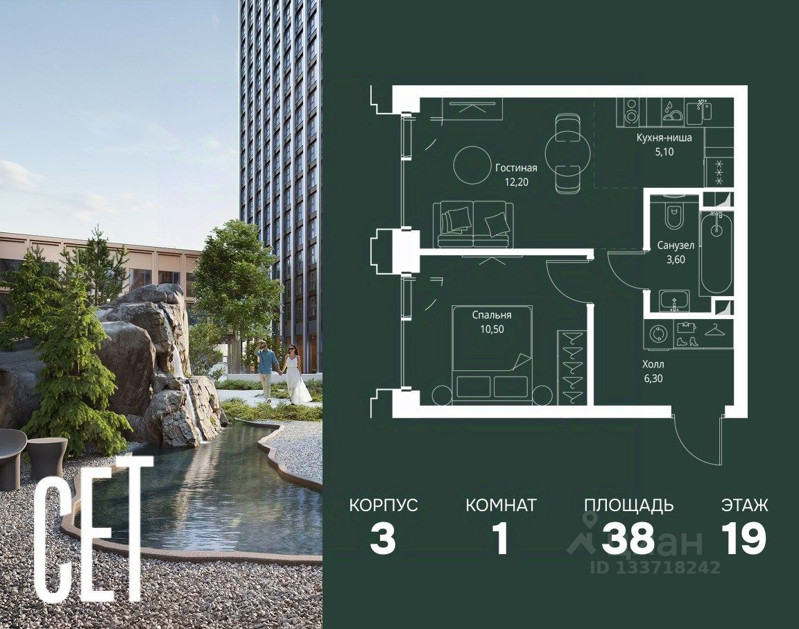 В ЖК Сет продается 1-комнатная квартира площадью 38 м², расположенная в корпусе 3, на 19 этаже 45 этажного дома.