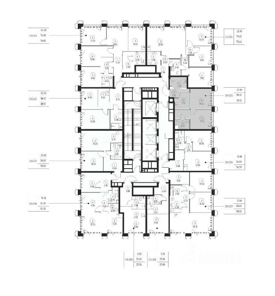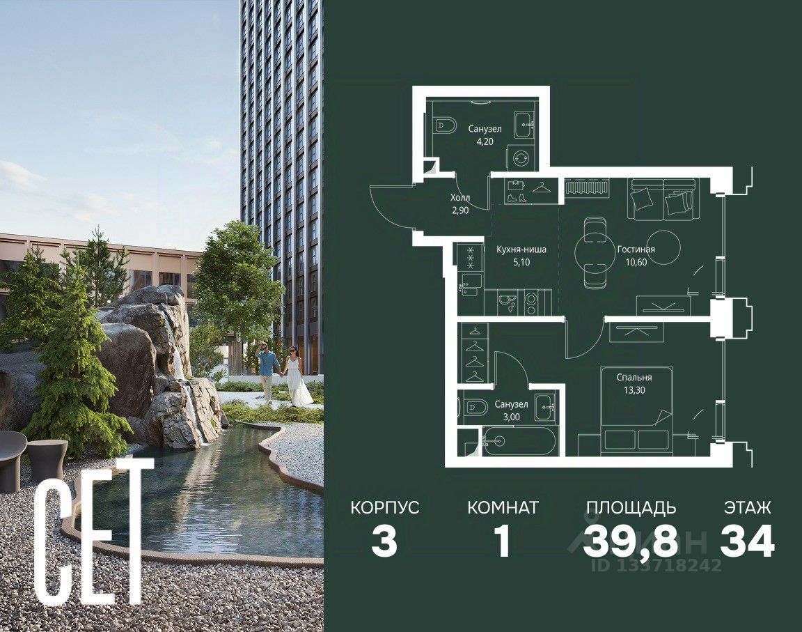 В ЖК Сет продается 1-комнатная квартира площадью 39.80 м², расположенная в корпусе 3, на 34 этаже 45 этажного дома.