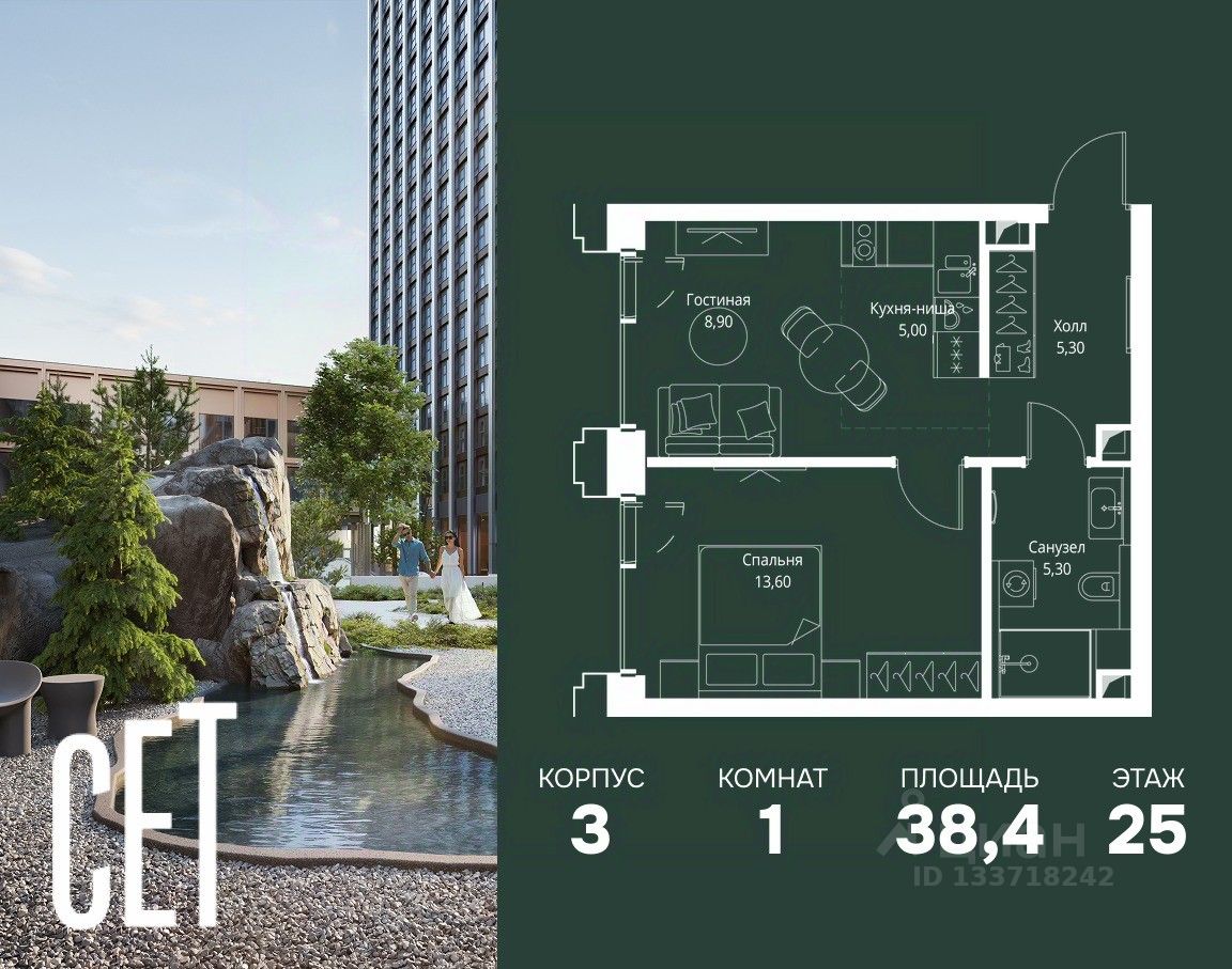 В ЖК Сет продается 1-комнатная квартира площадью 38.40 м², расположенная в корпусе 3, на 25 этаже 45 этажного дома.