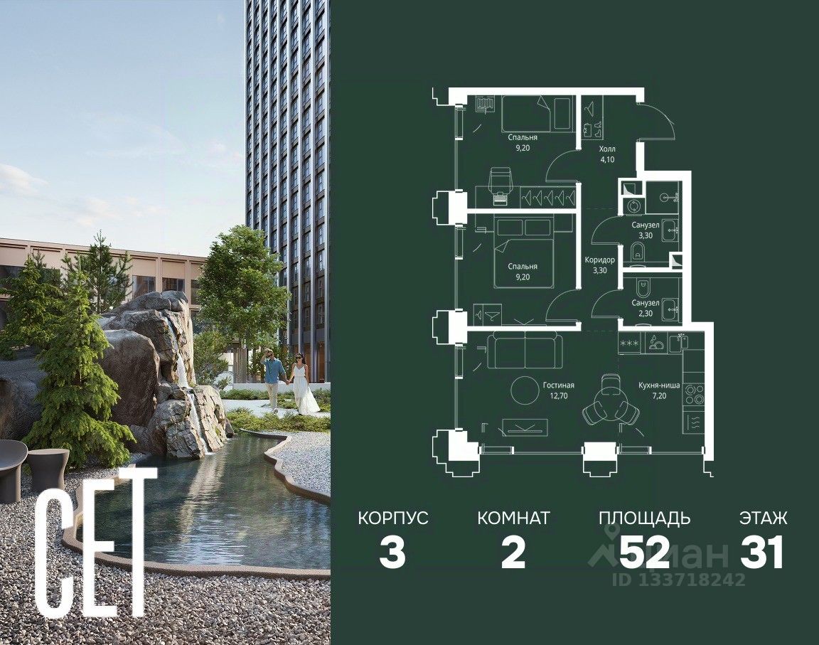 В ЖК Сет продается 2-комнатная квартира площадью 52 м², расположенная в корпусе 3, на 31 этаже 45 этажного дома.