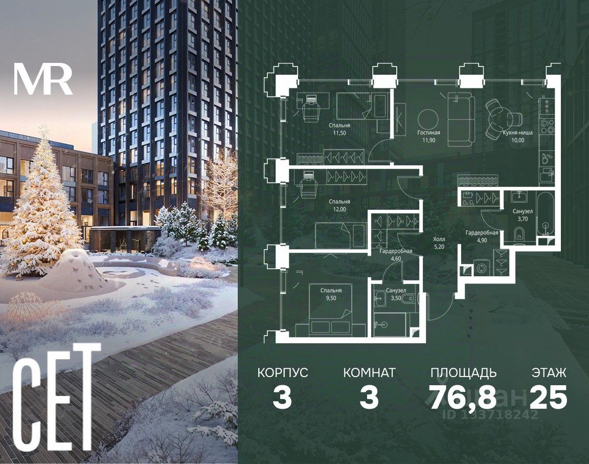 В ЖК Сет продается 3-комнатная квартира площадью 76.80 м², расположенная в корпусе 3, на 25 этаже 45 этажного дома.