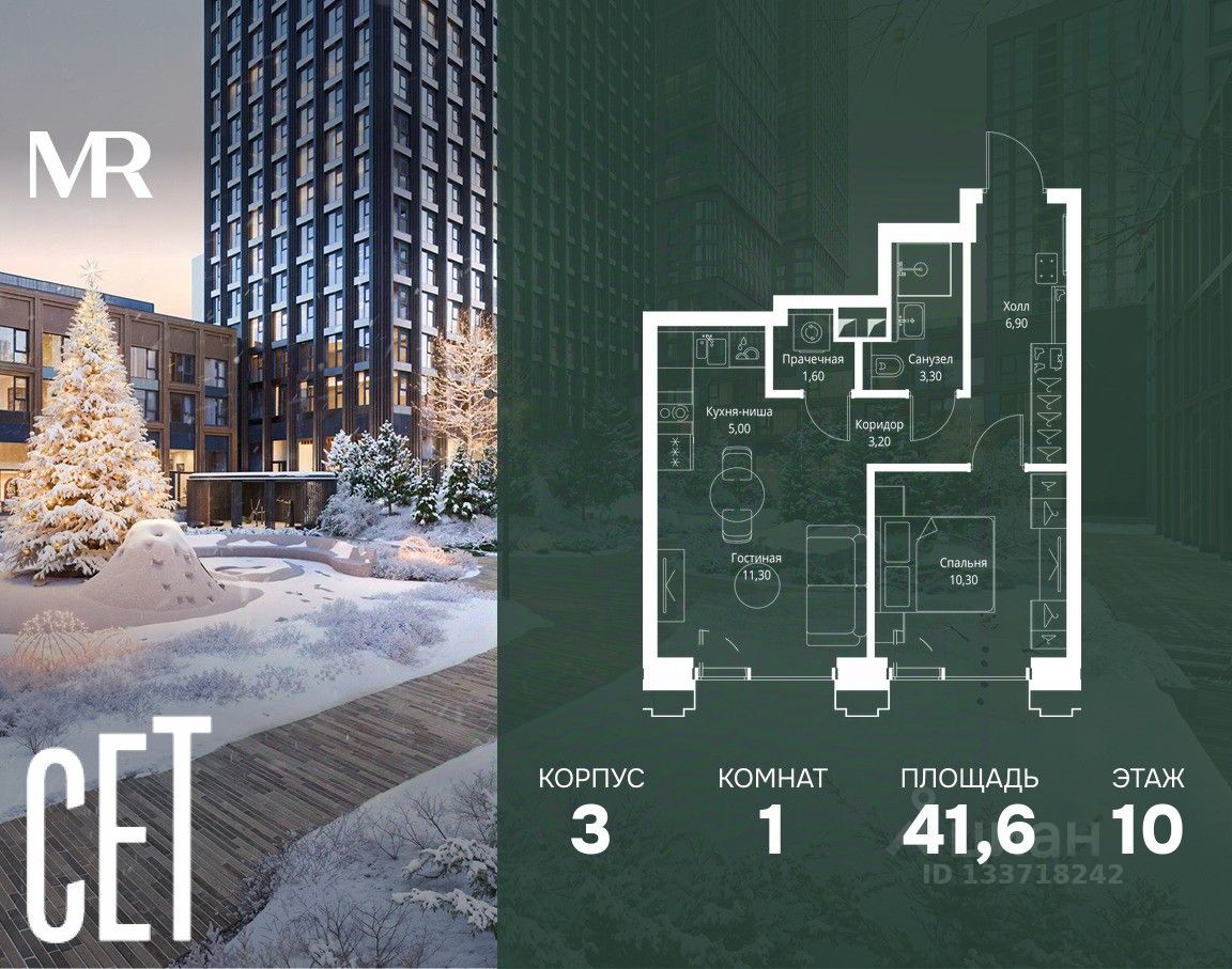 В ЖК Сет продается 1-комнатная квартира площадью 41.60 м², расположенная в корпусе 3, на 10 этаже 45 этажного дома.