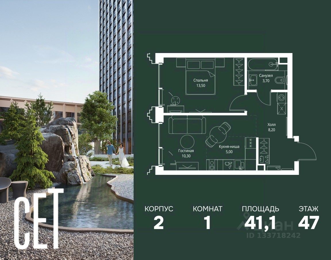 В ЖК Сет продается 1-комнатная квартира площадью 41.10 м², расположенная в корпусе 2, на 47 этаже 59 этажного дома.