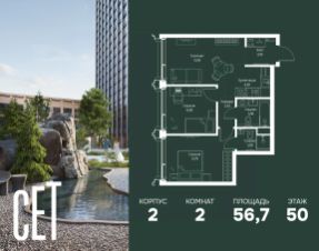 В ЖК Сет продается 2-комнатная квартира площадью 56.70 м², расположенная в корпусе 2, на 50 этаже 59 этажного дома.