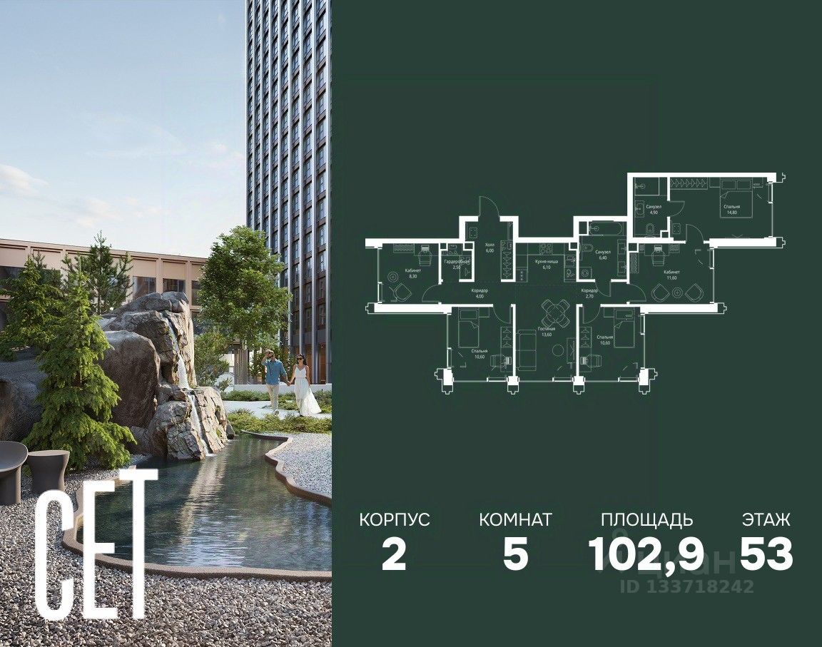 В ЖК Сет продается 5-комнатная квартира площадью 102.90 м², расположенная в корпусе 2, на 53 этаже 59 этажного дома.