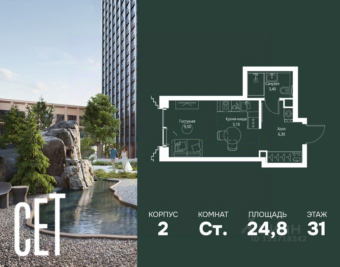 В ЖК Сет продается студия площадью 24.80 м², расположенная в корпусе 2, на 31 этаже 59 этажного дома.