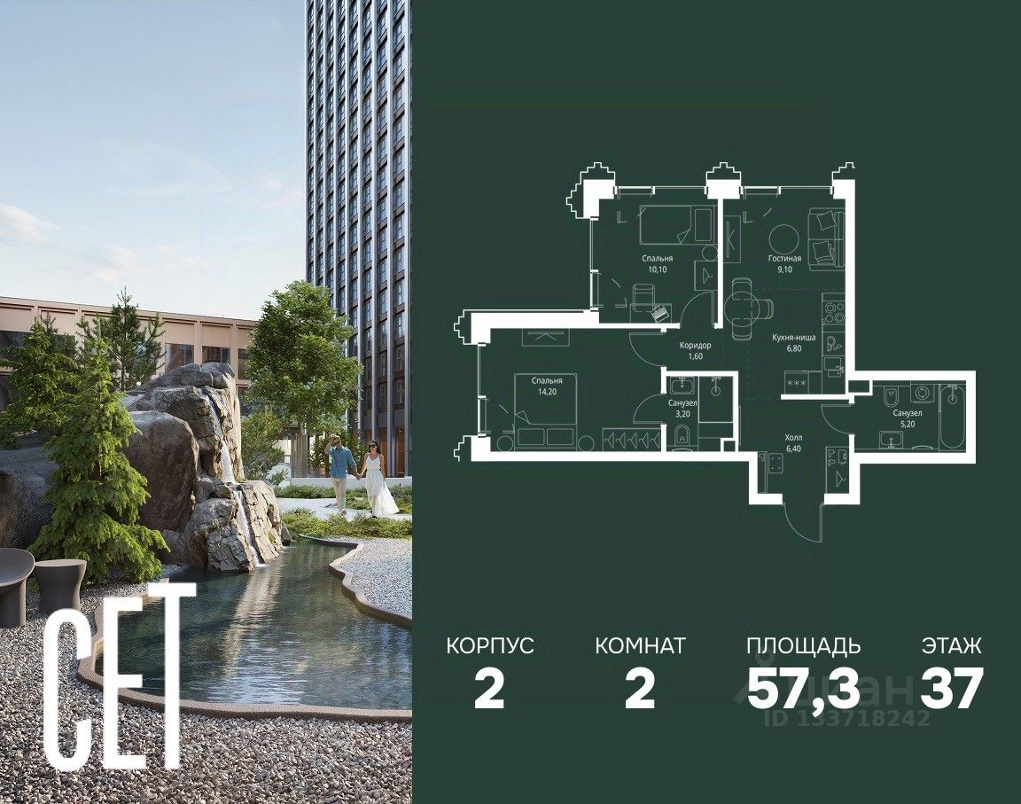 В ЖК Сет продается 2-комнатная квартира площадью 57.30 м², расположенная в корпусе 2, на 37 этаже 59 этажного дома.