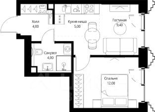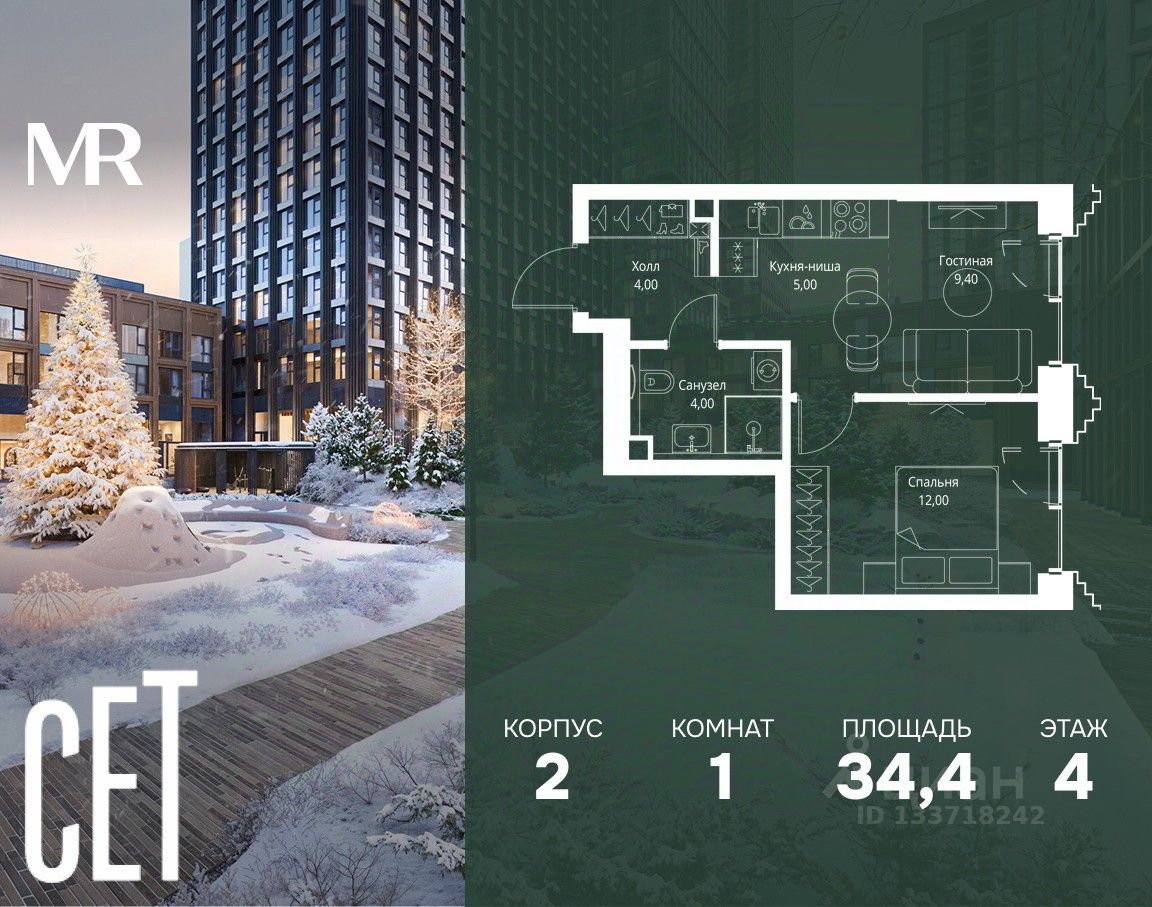 В ЖК Сет продается 1-комнатная квартира площадью 34.40 м², расположенная в корпусе 2, на 4 этаже 59 этажного дома.