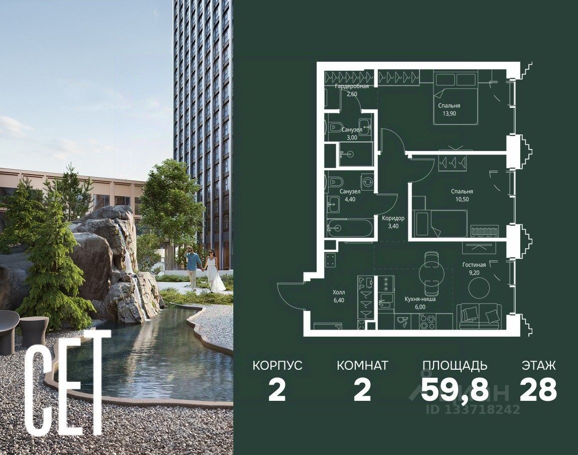 В ЖК Сет продается 2-комнатная квартира площадью 59.80 м², расположенная в корпусе 2, на 28 этаже 59 этажного дома.