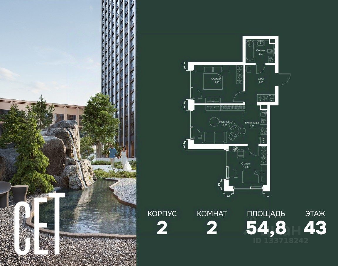 В ЖК Сет продается 2-комнатная квартира площадью 54.80 м², расположенная в корпусе 2, на 43 этаже 59 этажного дома.