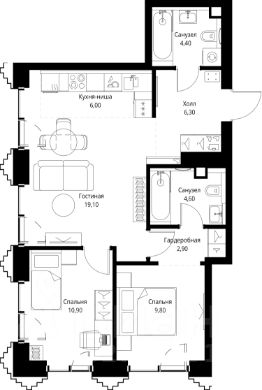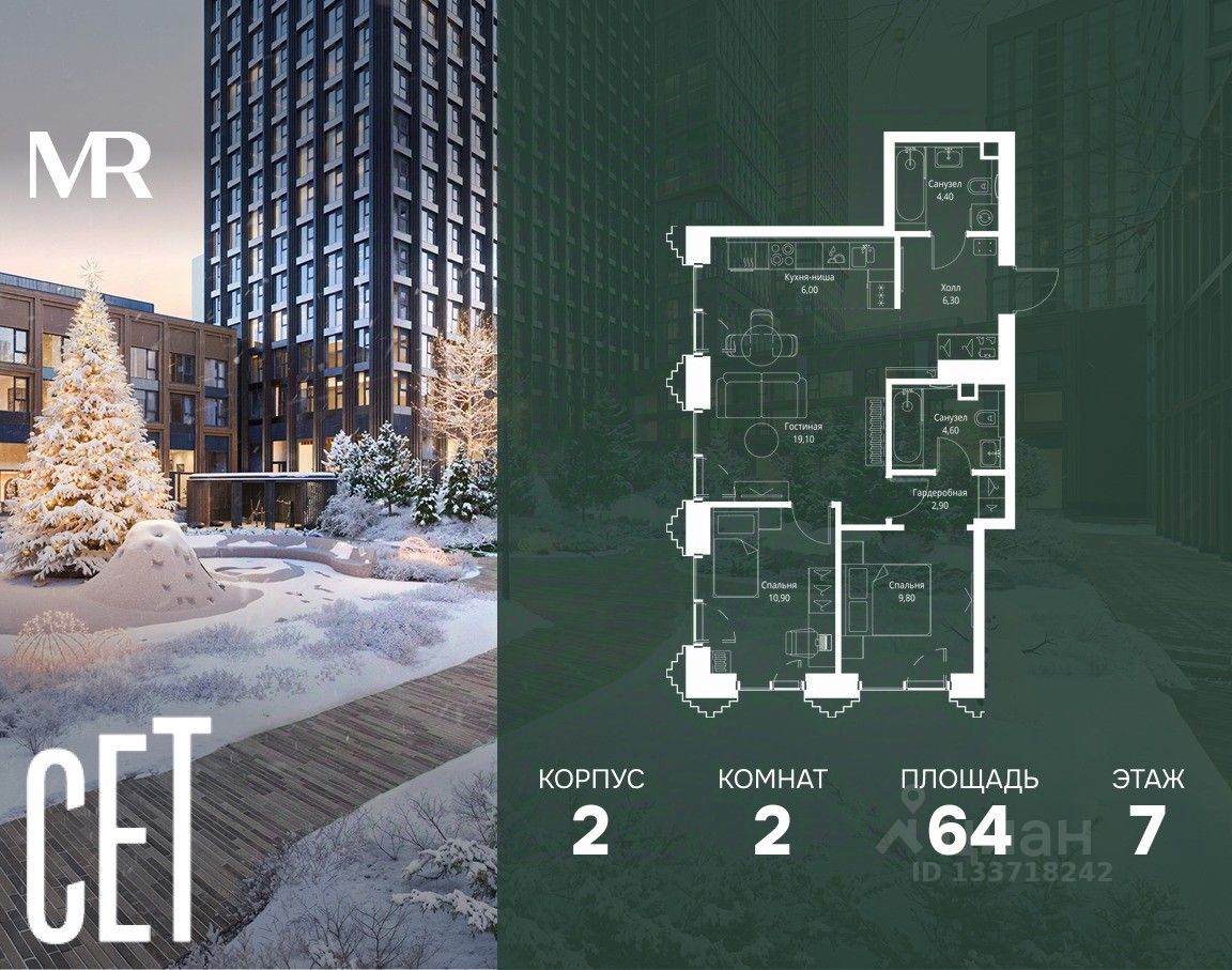 В ЖК Сет продается 2-комнатная квартира площадью 64 м², расположенная в корпусе 2, на 7 этаже 59 этажного дома.