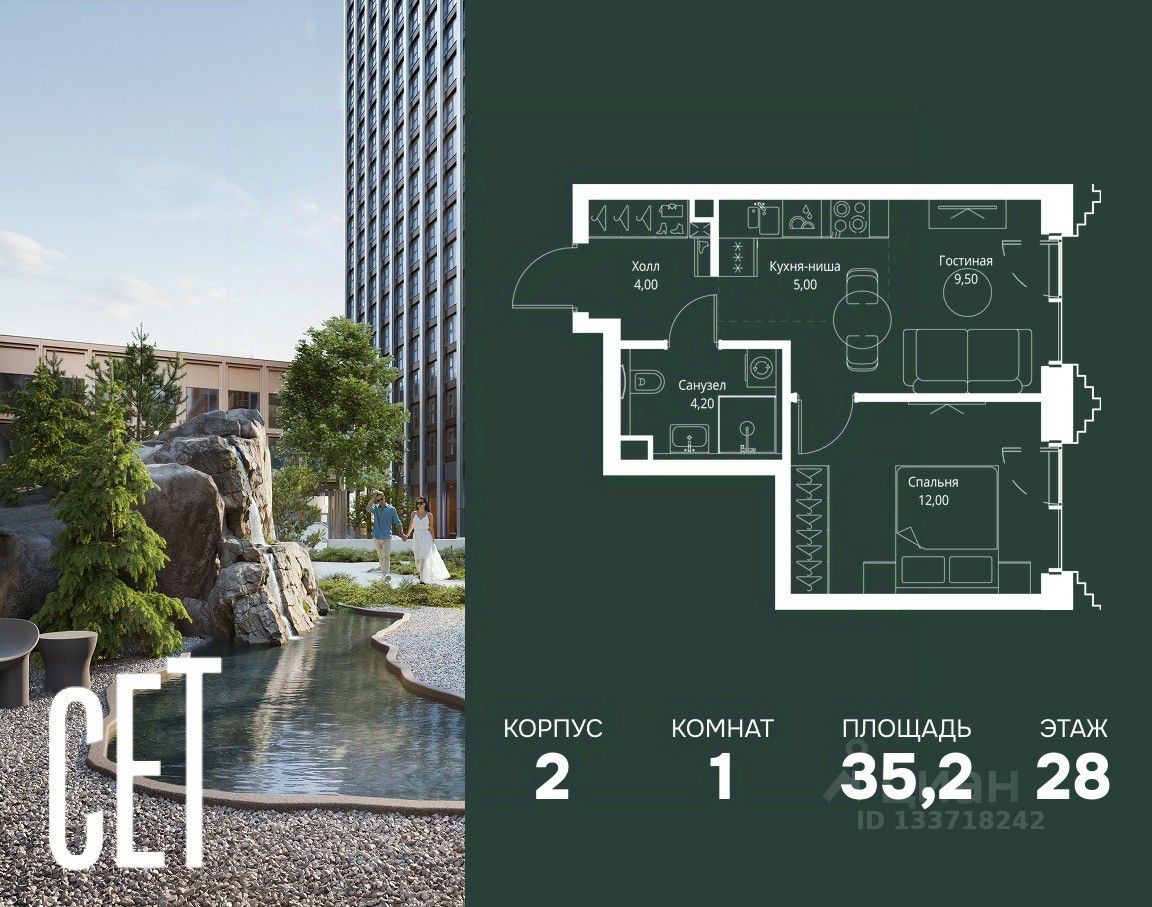 В ЖК Сет продается 1-комнатная квартира площадью 35.20 м², расположенная в корпусе 2, на 28 этаже 59 этажного дома.