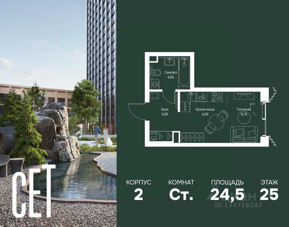 В ЖК Сет продается студия площадью 24.50 м², расположенная в корпусе 2, на 25 этаже 59 этажного дома.