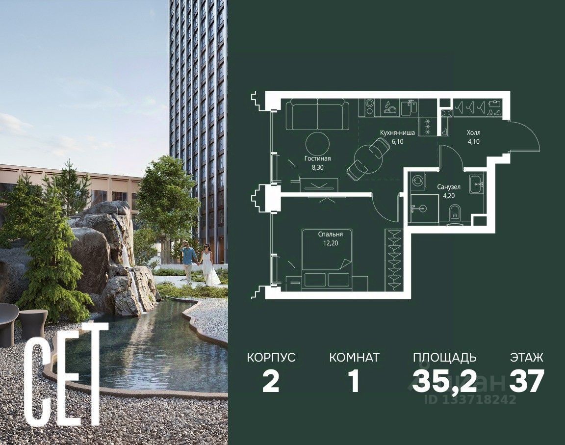 В ЖК Сет продается 1-комнатная квартира площадью 35.20 м², расположенная в корпусе 2, на 37 этаже 59 этажного дома.