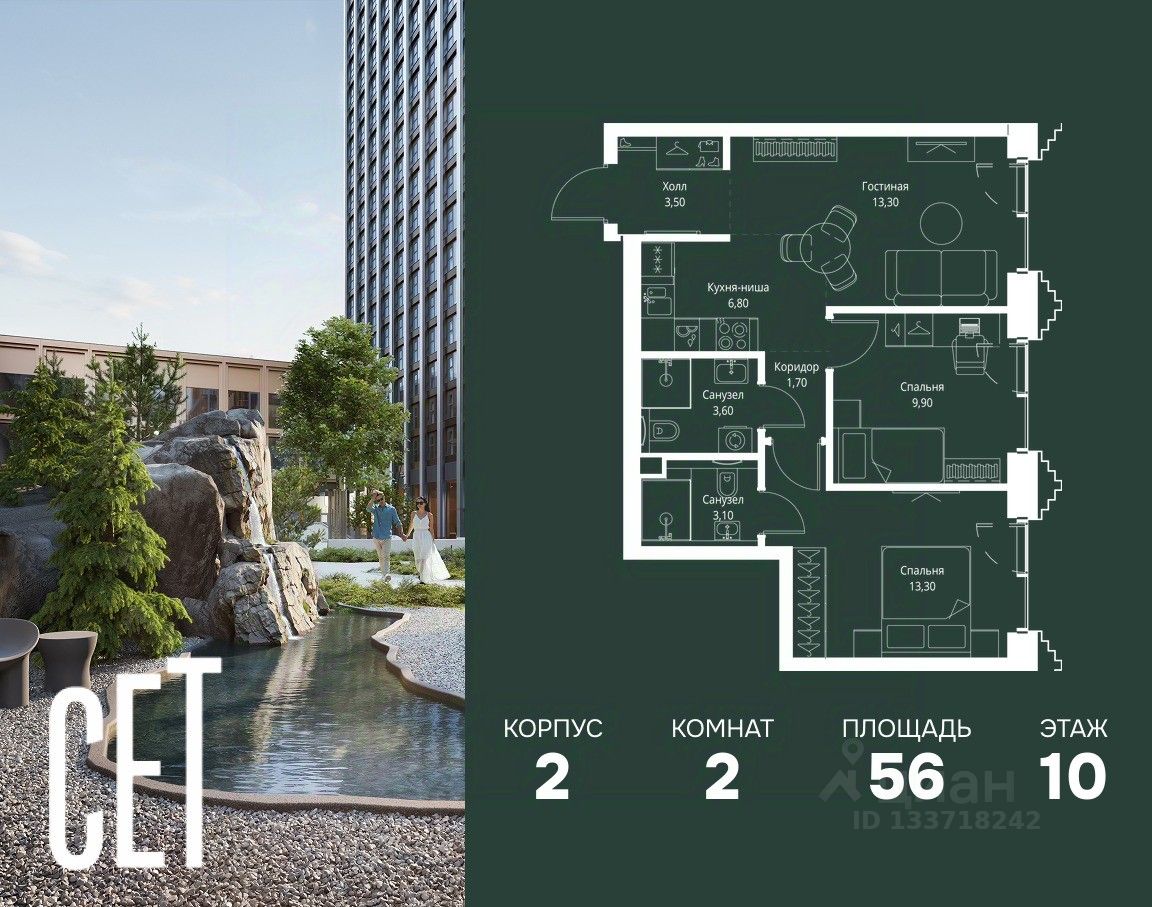 В ЖК Сет продается 2-комнатная квартира площадью 56 м², расположенная в корпусе 2, на 10 этаже 59 этажного дома.