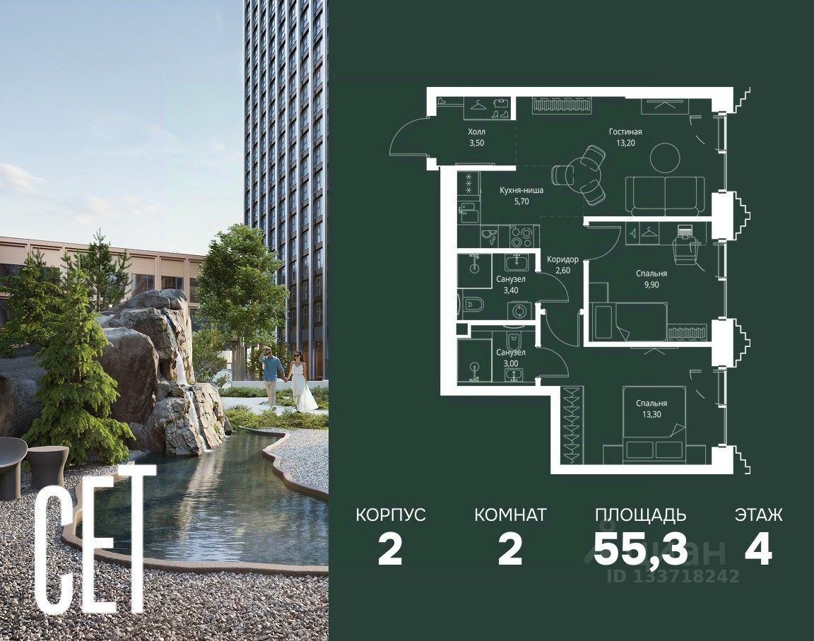 В ЖК Сет продается 2-комнатная квартира площадью 55.30 м², расположенная в корпусе 2, на 4 этаже 59 этажного дома.