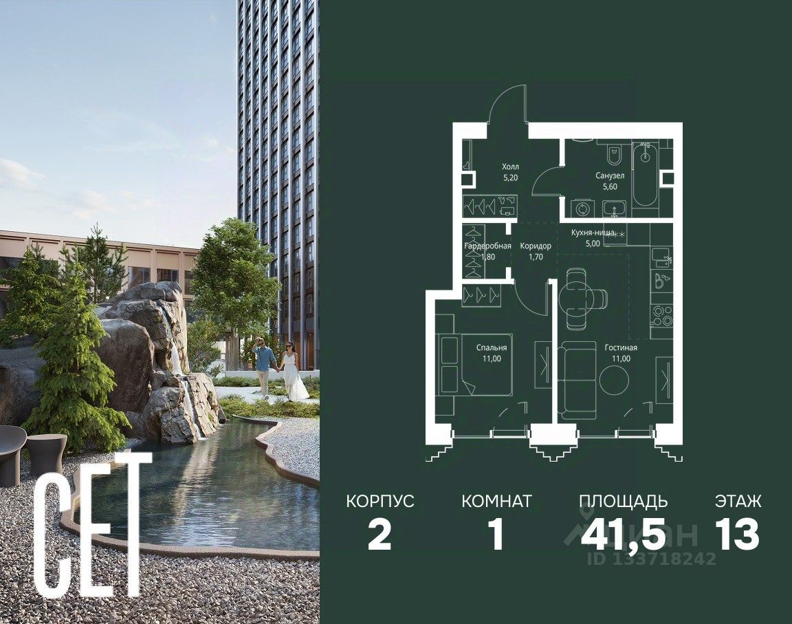 В ЖК Сет продается 1-комнатная квартира площадью 41.50 м², расположенная в корпусе 2, на 13 этаже 59 этажного дома.