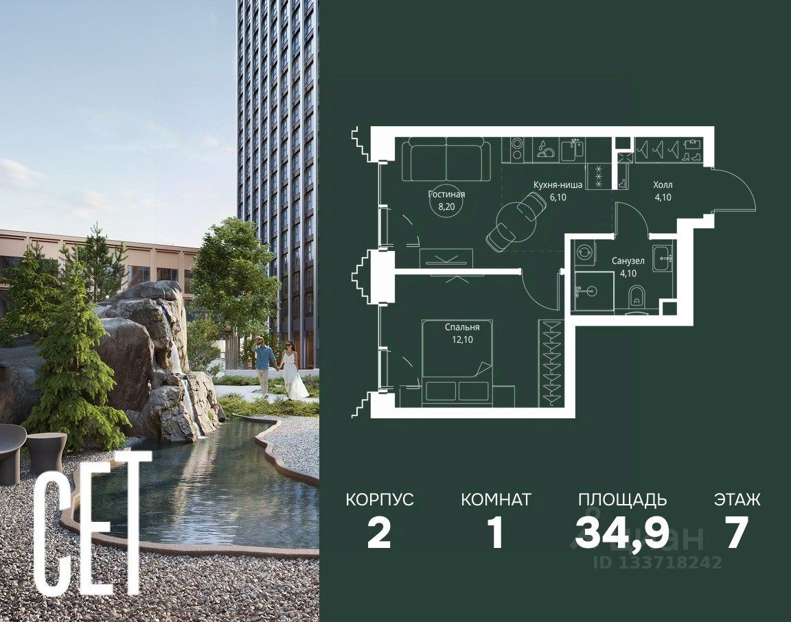 В ЖК Сет продается 1-комнатная квартира площадью 34.90 м², расположенная в корпусе 2, на 7 этаже 59 этажного дома.