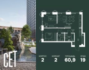 В ЖК Сет продается 2-комнатная квартира площадью 60.90 м², расположенная в корпусе 2, на 19 этаже 59 этажного дома.