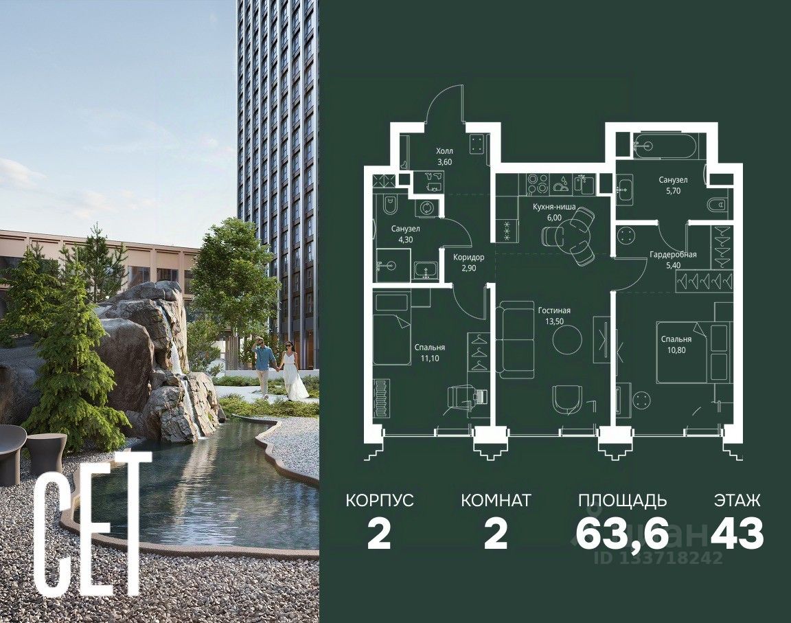 В ЖК Сет продается 2-комнатная квартира площадью 63.60 м², расположенная в корпусе 2, на 43 этаже 59 этажного дома.
