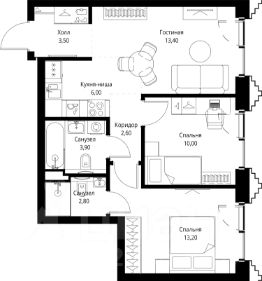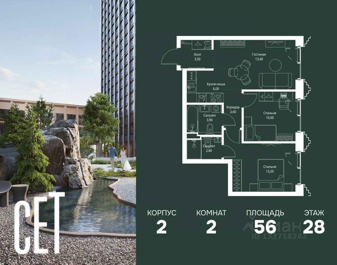 В ЖК Сет продается 2-комнатная квартира площадью 56 м², расположенная в корпусе 2, на 28 этаже 59 этажного дома.