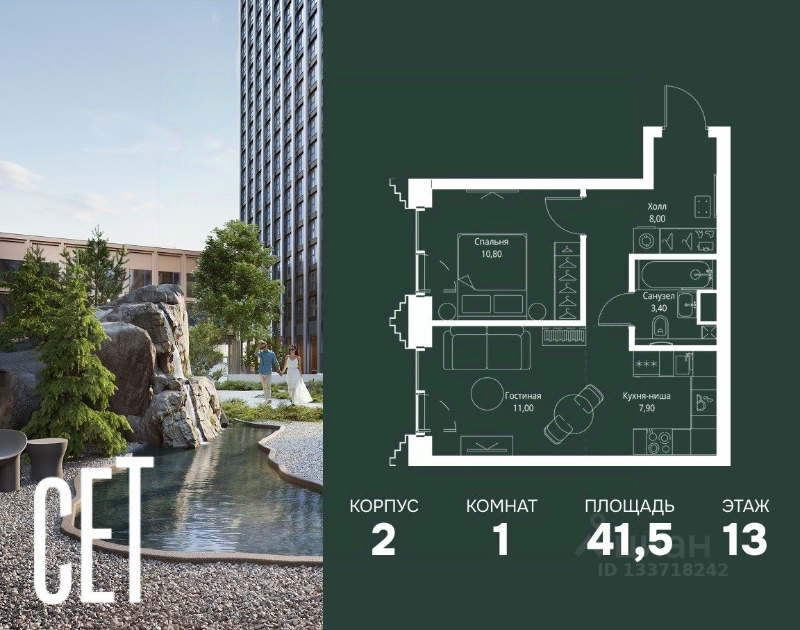 В ЖК Сет продается 1-комнатная квартира площадью 41.50 м², расположенная в корпусе 2, на 13 этаже 59 этажного дома.