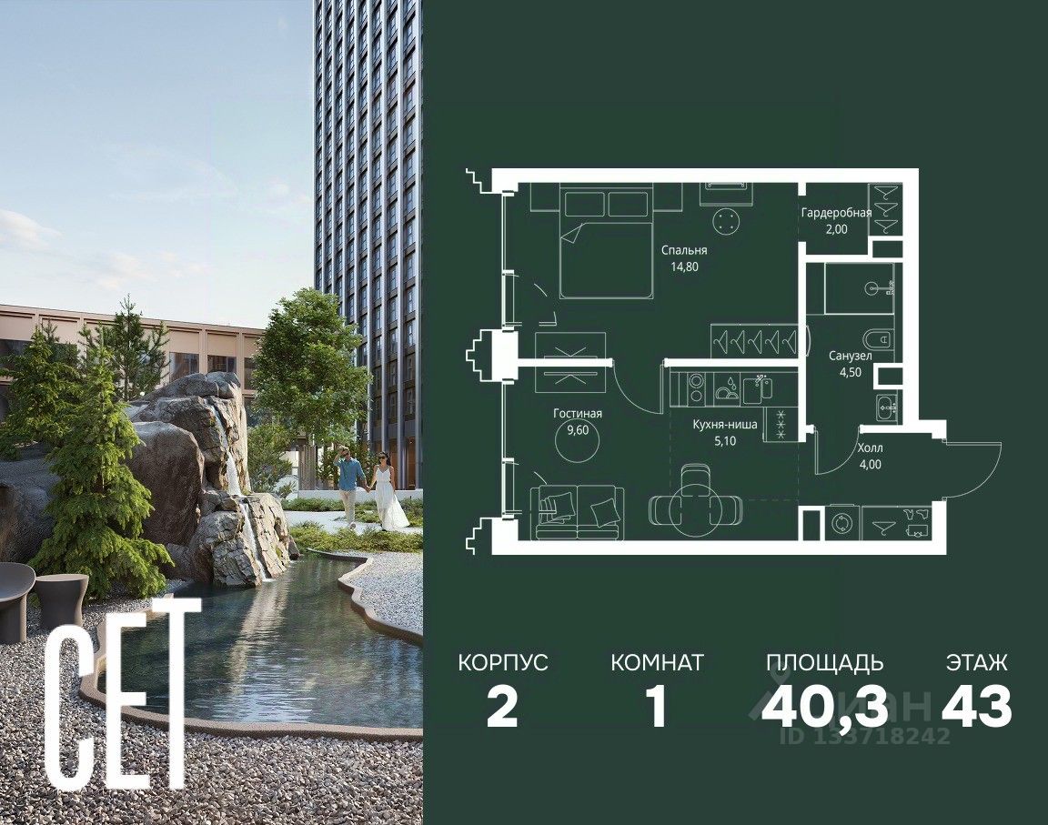 В ЖК Сет продается 1-комнатная квартира площадью 40.30 м², расположенная в корпусе 2, на 43 этаже 59 этажного дома.