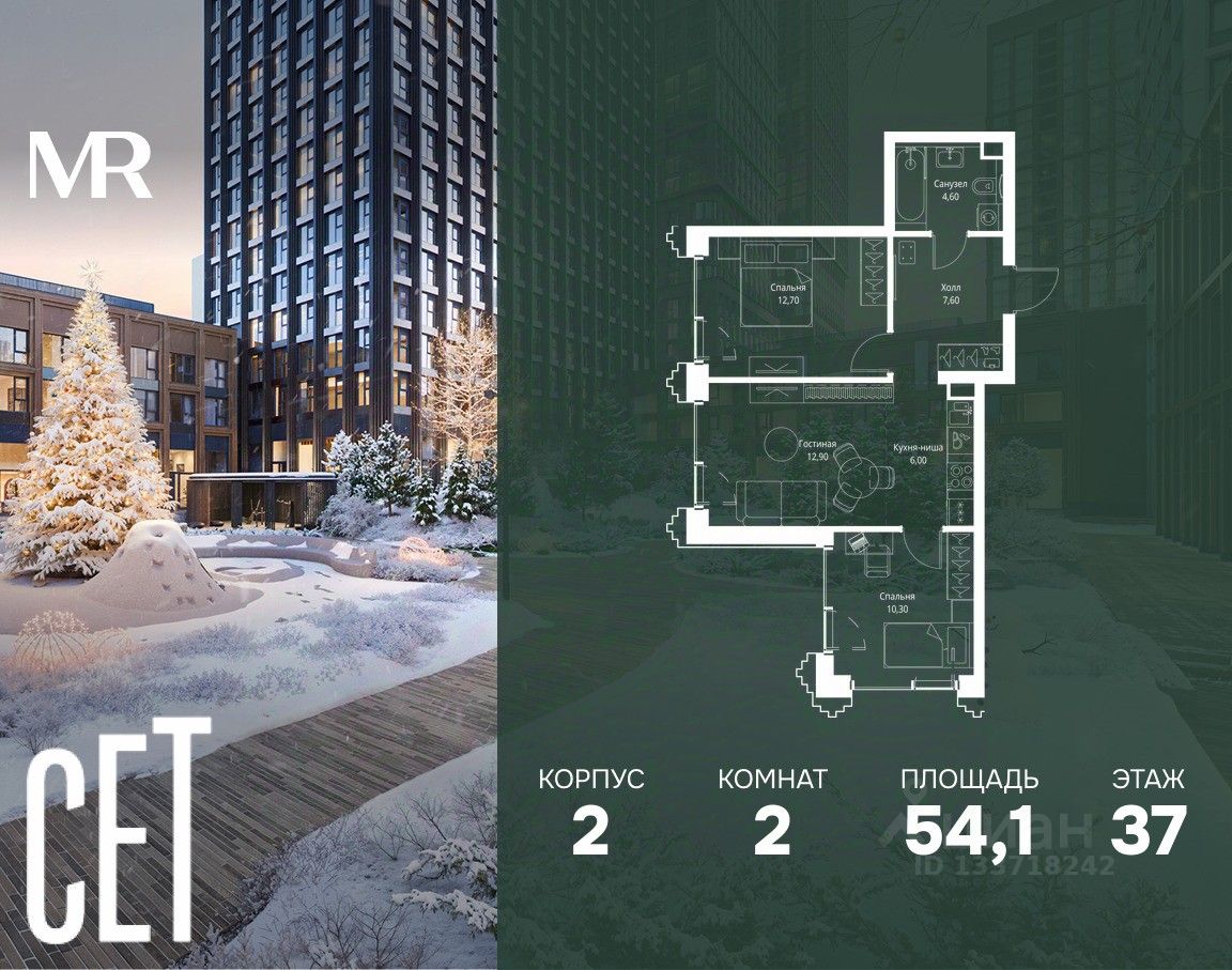 В ЖК Сет продается 2-комнатная квартира площадью 54.10 м², расположенная в корпусе 2, на 37 этаже 59 этажного дома.