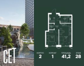 В ЖК Сет продается 1-комнатная квартира площадью 41.20 м², расположенная в корпусе 2, на 28 этаже 59 этажного дома.