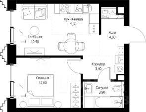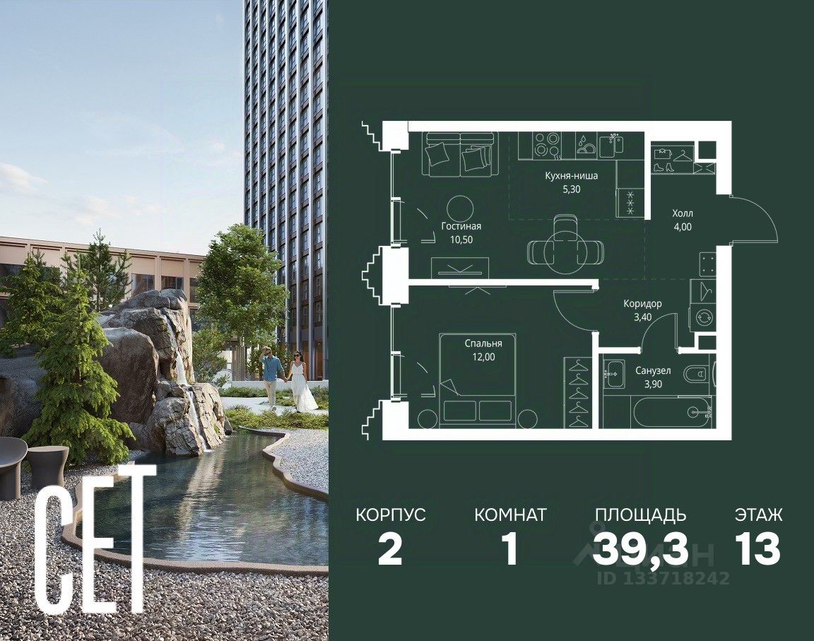 В ЖК Сет продается 1-комнатная квартира площадью 39.30 м², расположенная в корпусе 2, на 13 этаже 59 этажного дома.