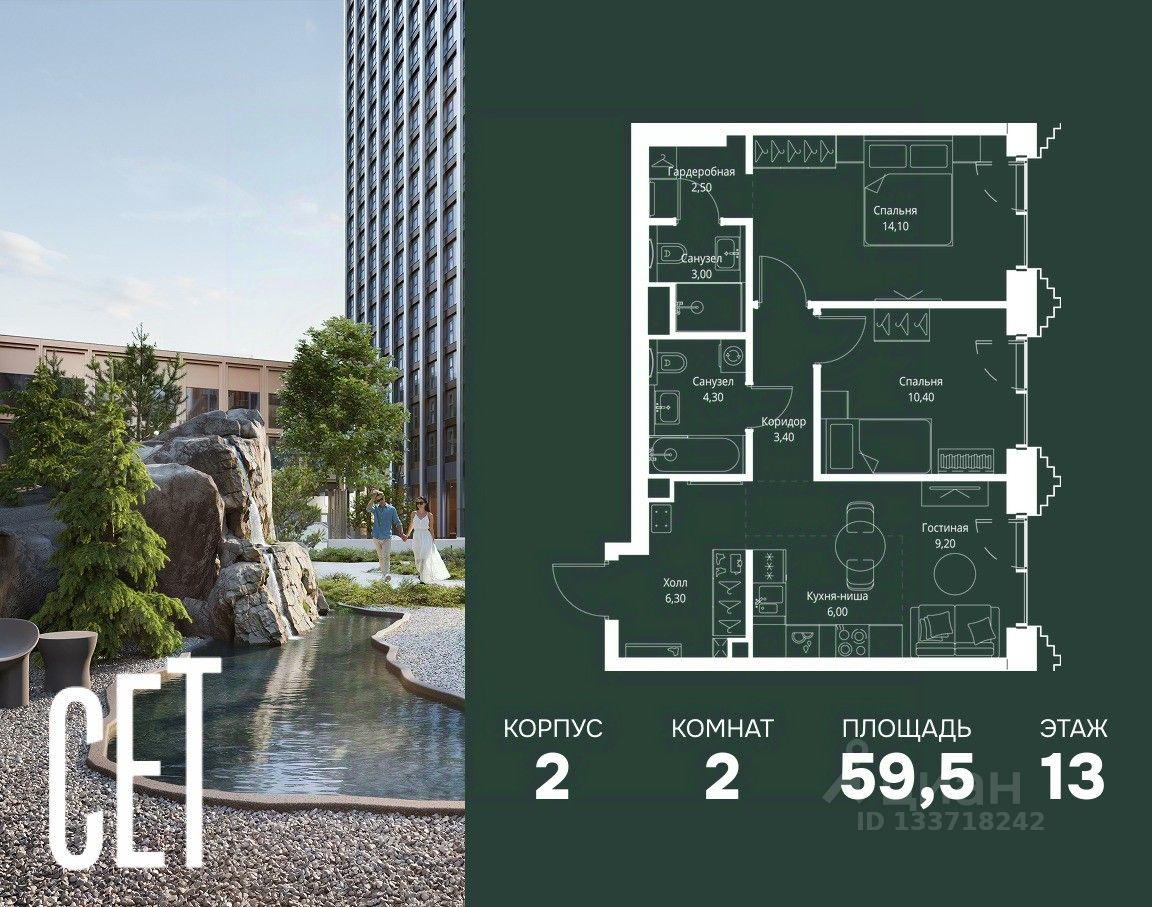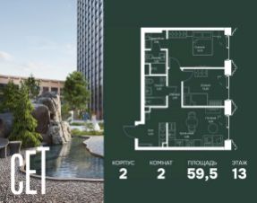 В ЖК Сет продается 2-комнатная квартира площадью 59.50 м², расположенная в корпусе 2, на 13 этаже 59 этажного дома.