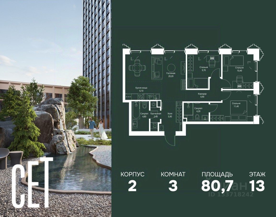 В ЖК Сет продается 3-комнатная квартира площадью 80.70 м², расположенная в корпусе 2, на 13 этаже 59 этажного дома.