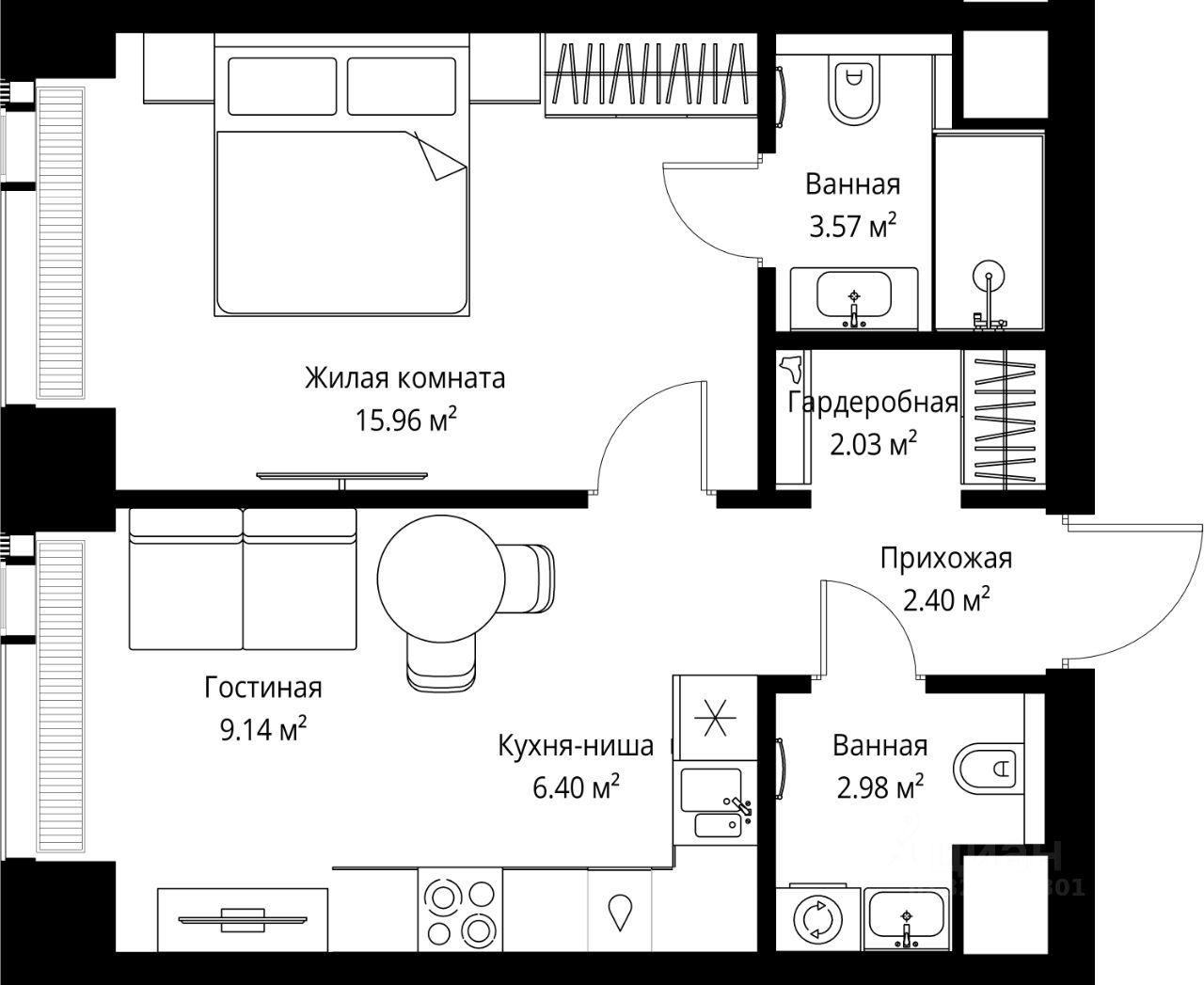 Продаётся 1-комнатная квартира общей площадью 42.48 м² без отделки в ЖК Веер на 38-м этаже 70 этажного дома.