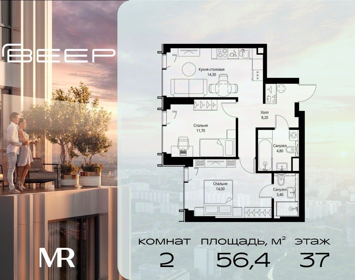 Продаётся 2-комнатная квартира общей площадью 56.40 м² с предчистовой отделкой в ЖК Веер на 37-м этаже 59 этажного дома.