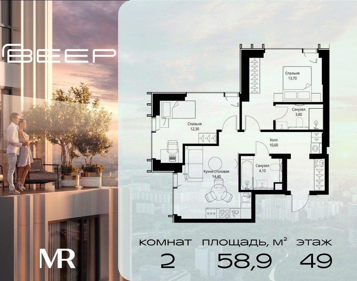 Продаётся 2-комнатная квартира общей площадью 58.90 м² с предчистовой отделкой в ЖК Веер на 49-м этаже 59 этажного дома.