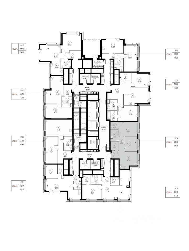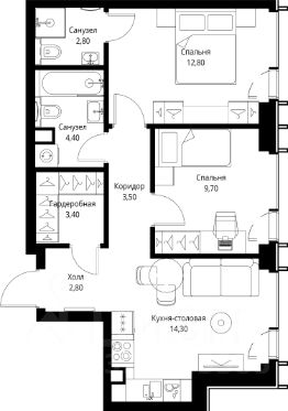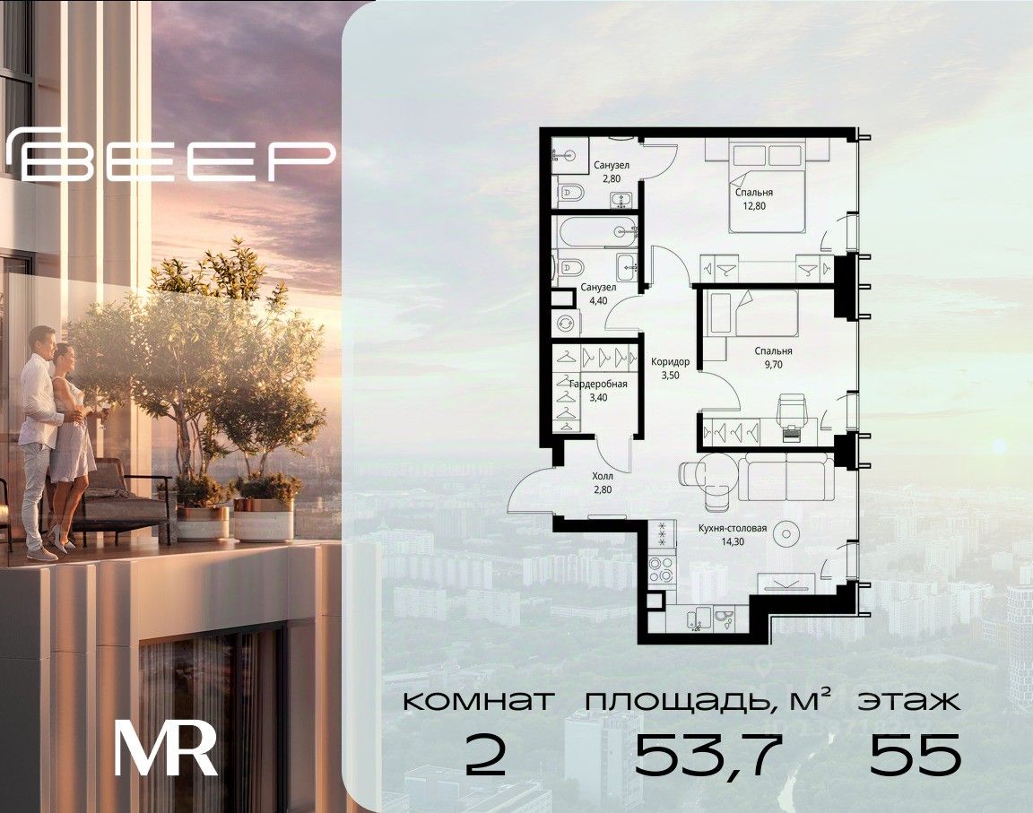 Продаётся 2-комнатная квартира общей площадью 53.70 м² с предчистовой отделкой в ЖК Веер на 55-м этаже 59 этажного дома.