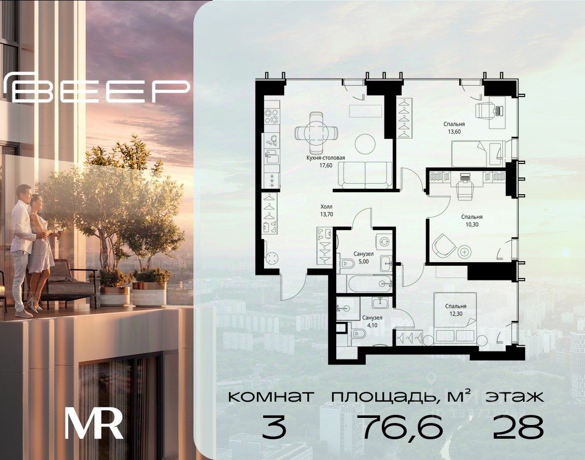 Продаётся 3-комнатная квартира общей площадью 76.60 м² с предчистовой отделкой в ЖК Веер на 28-м этаже 59 этажного дома.