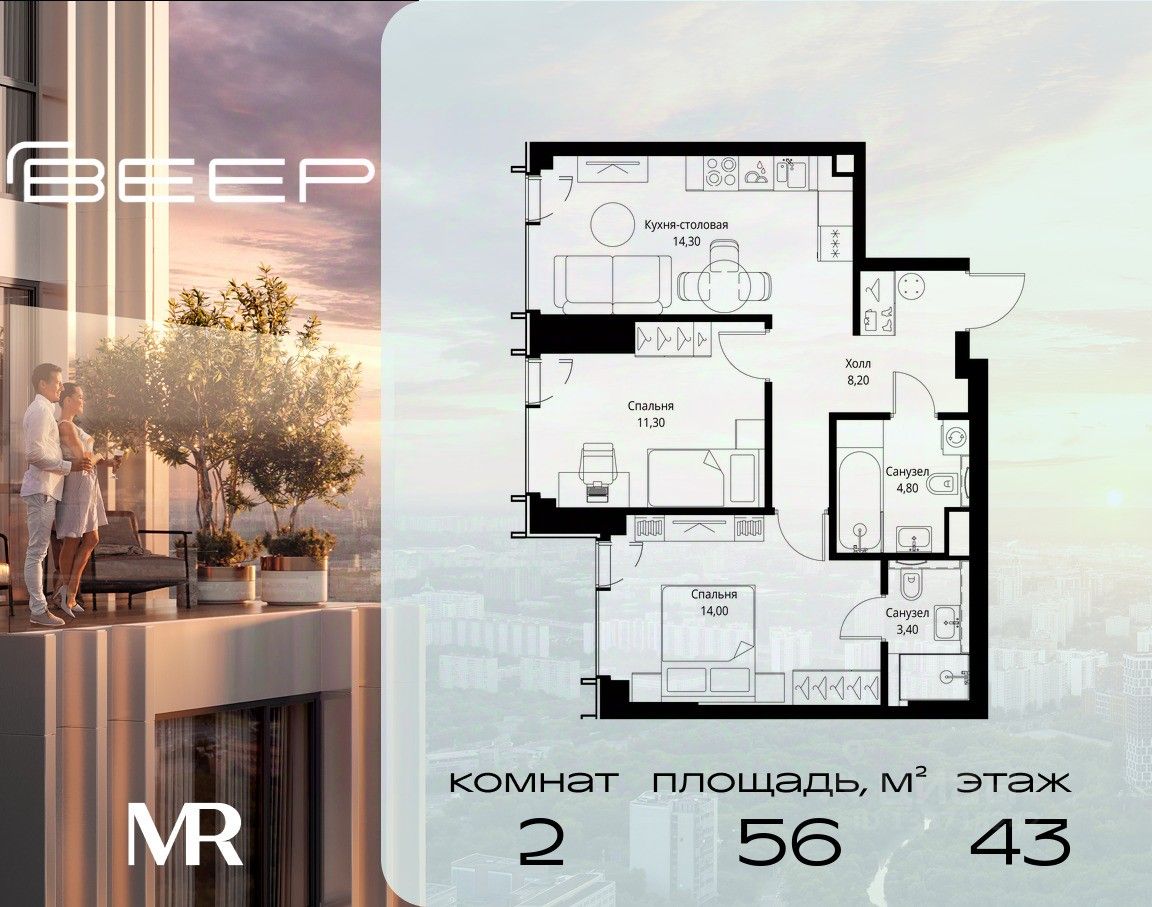 Продаётся 2-комнатная квартира общей площадью 56 м² с предчистовой отделкой в ЖК Веер на 43-м этаже 59 этажного дома.