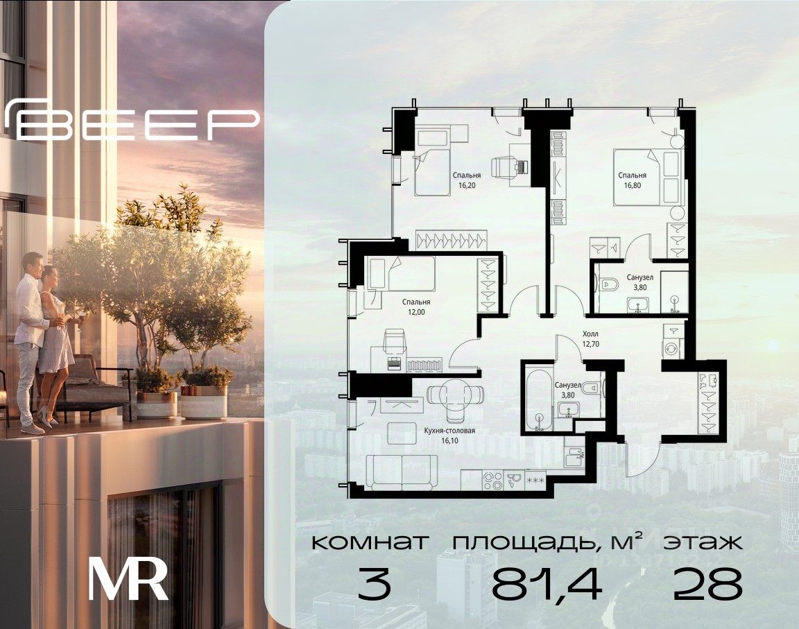 Продаётся 3-комнатная квартира общей площадью 81.40 м² с предчистовой отделкой в ЖК Веер на 28-м этаже 59 этажного дома.