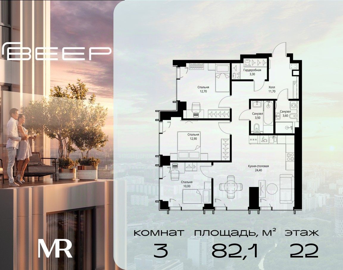 Продаётся 3-комнатная квартира общей площадью 82.10 м² с предчистовой отделкой в ЖК Веер на 22-м этаже 59 этажного дома.