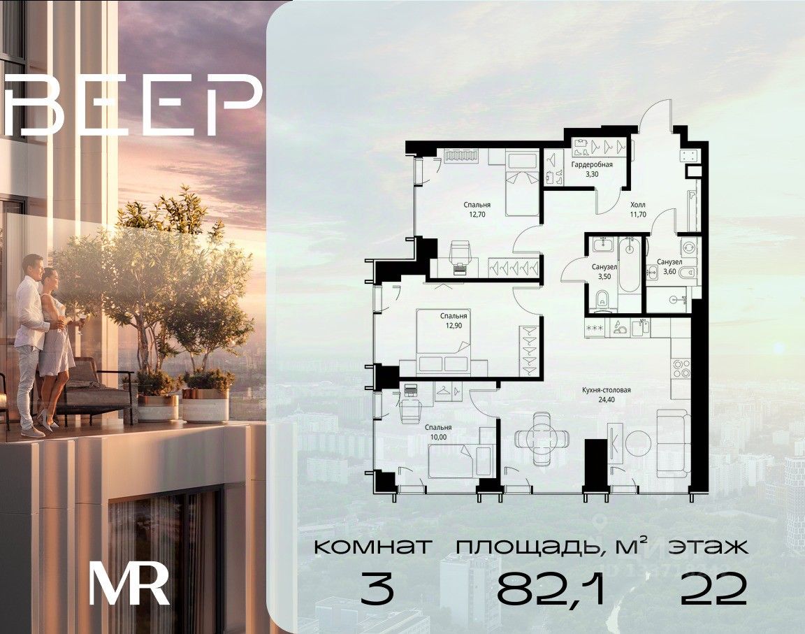 Продаётся 3-комнатная квартира общей площадью 82.10 м² без отделки в ЖК Веер на 22-м этаже 59 этажного дома.