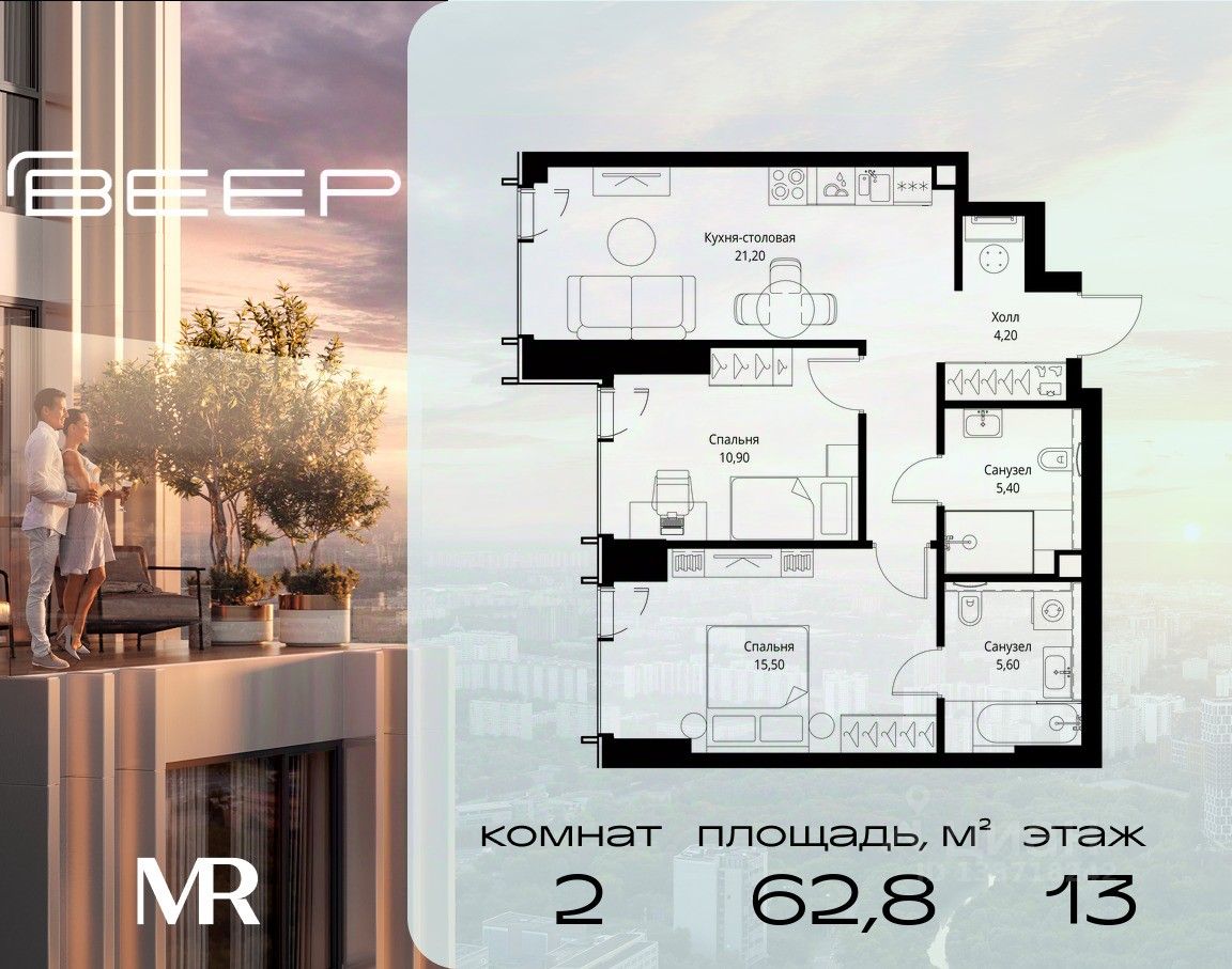 Продаётся 2-комнатная квартира общей площадью 62.80 м² с предчистовой отделкой в ЖК Веер на 13-м этаже 59 этажного дома.