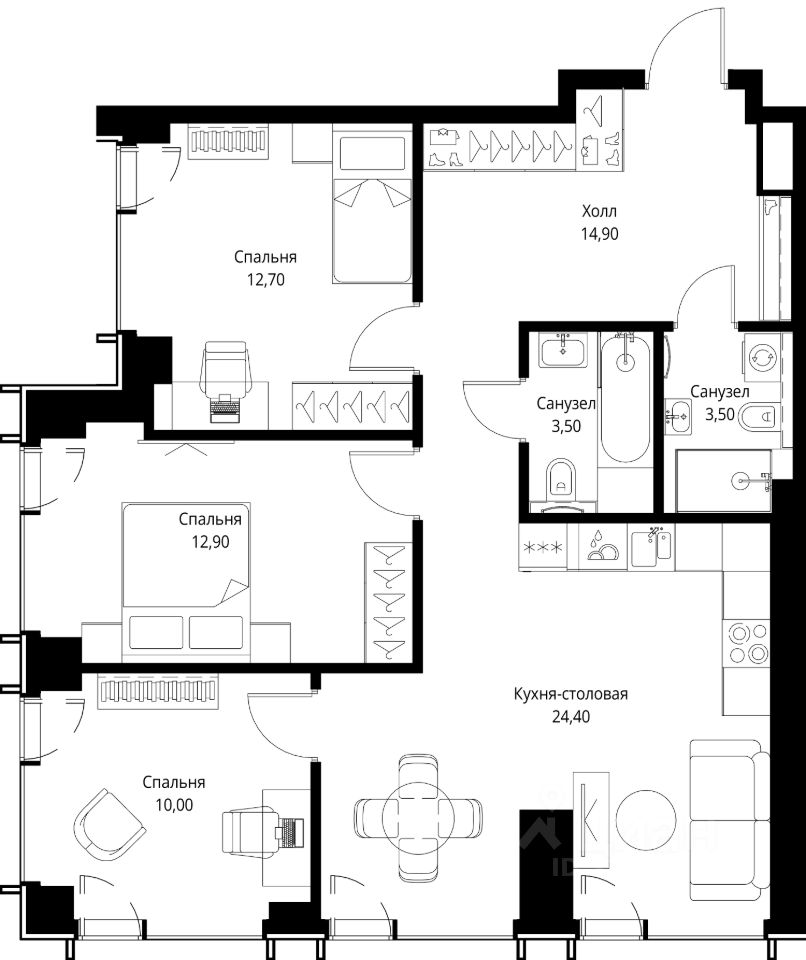Продаётся 3-комнатная квартира общей площадью 81.90 м² с предчистовой отделкой в ЖК Веер на 19-м этаже 59 этажного дома.