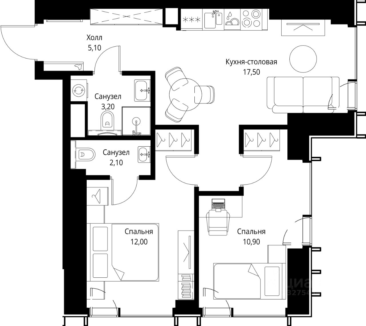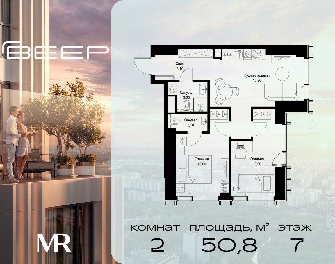 Продаётся 2-комнатная квартира общей площадью 50.80 м² с предчистовой отделкой в ЖК Веер на 7-м этаже 59 этажного дома.