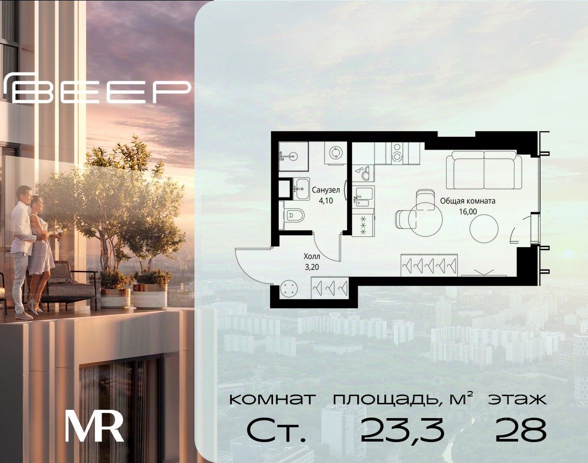 Продаётся студия общей площадью 23.30 м² с предчистовой отделкой в ЖК Веер на 28-м этаже 59 этажного дома.