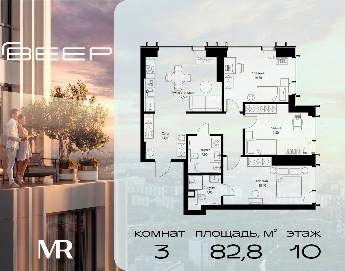 Продаётся 3-комнатная квартира общей площадью 82.80 м² с предчистовой отделкой в ЖК Веер на 10-м этаже 59 этажного дома.
