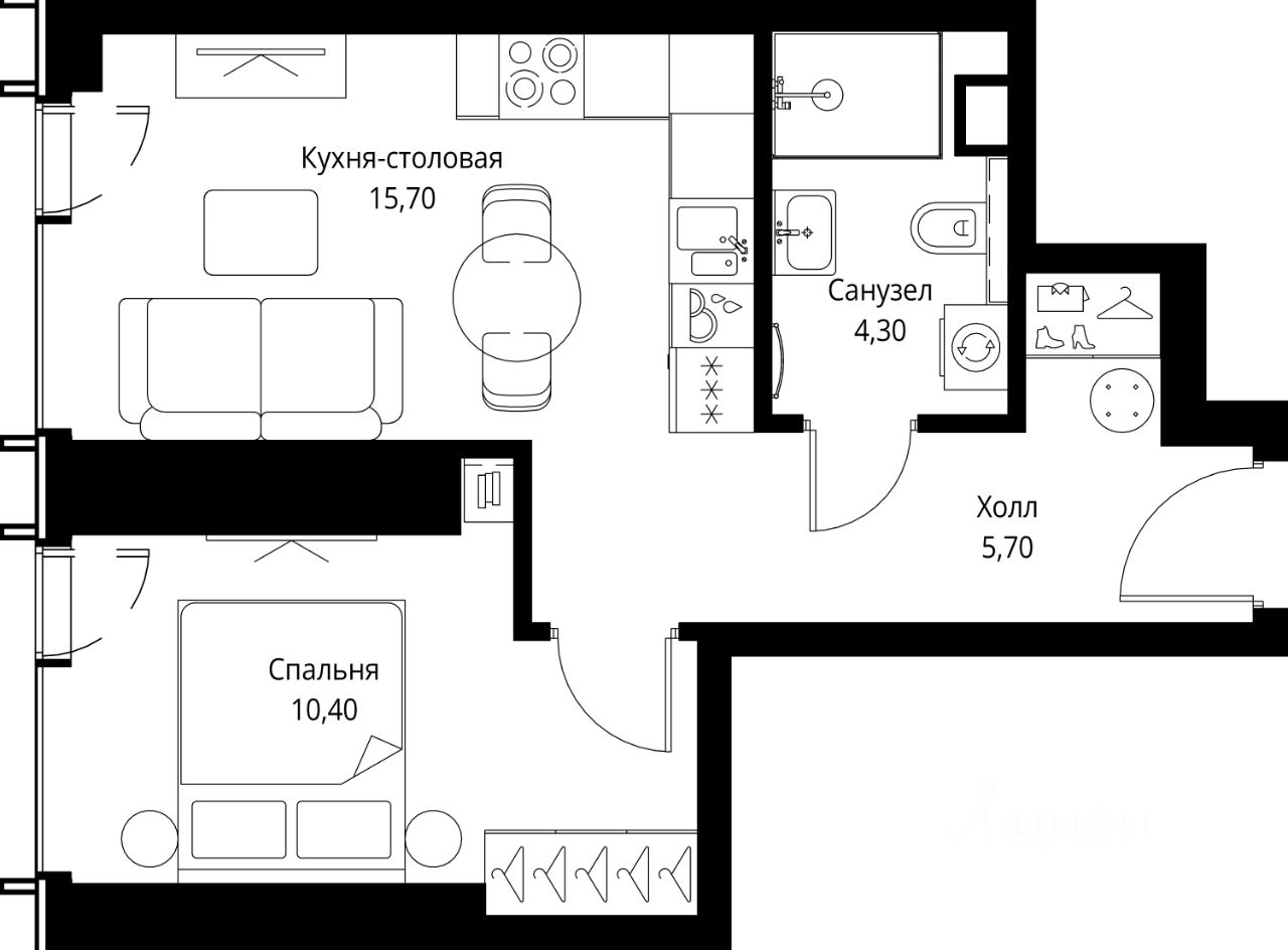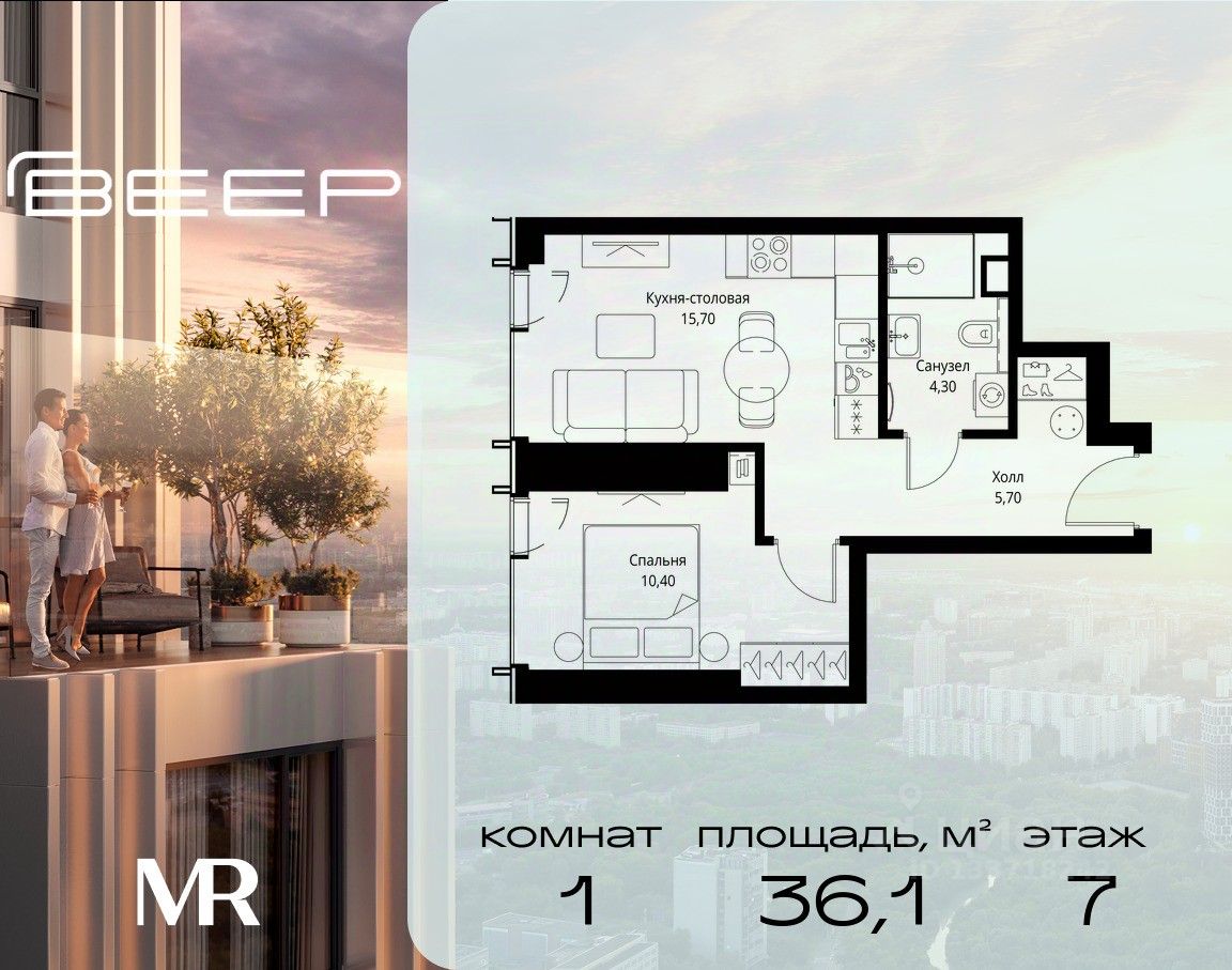 Продаётся 1-комнатная квартира общей площадью 36.10 м² с предчистовой отделкой в ЖК Веер на 7-м этаже 59 этажного дома.