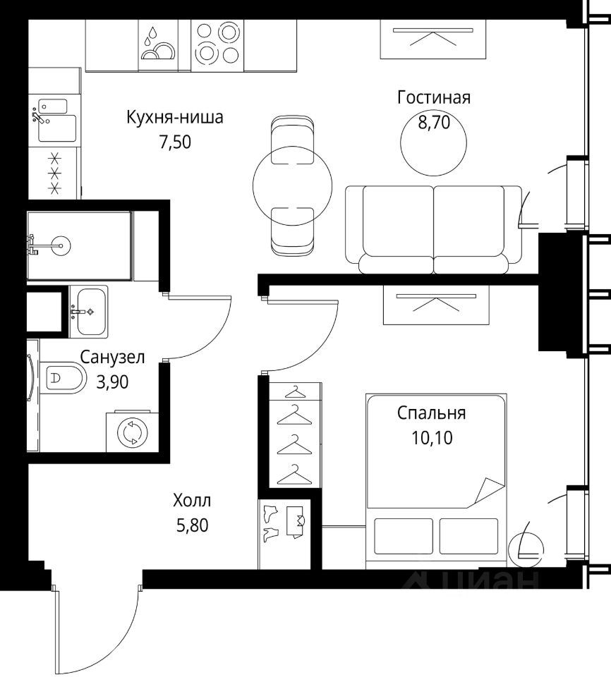 Продаётся 1-комнатная квартира общей площадью 36 м² с предчистовой отделкой в ЖК Веер на 43-м этаже 59 этажного дома.