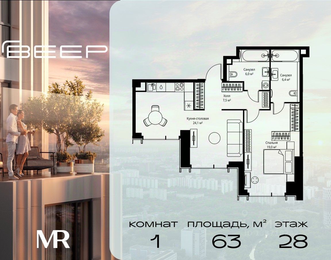 Продаётся 1-комнатная квартира общей площадью 63 м² без отделки в ЖК Веер на 28-м этаже 59 этажного дома.