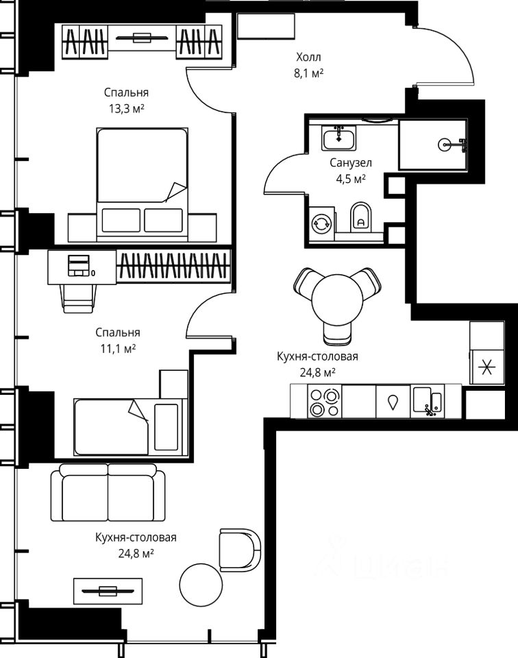 Продаётся 2-комнатная квартира общей площадью 61.80 м² без отделки в ЖК Веер на 28-м этаже 59 этажного дома.